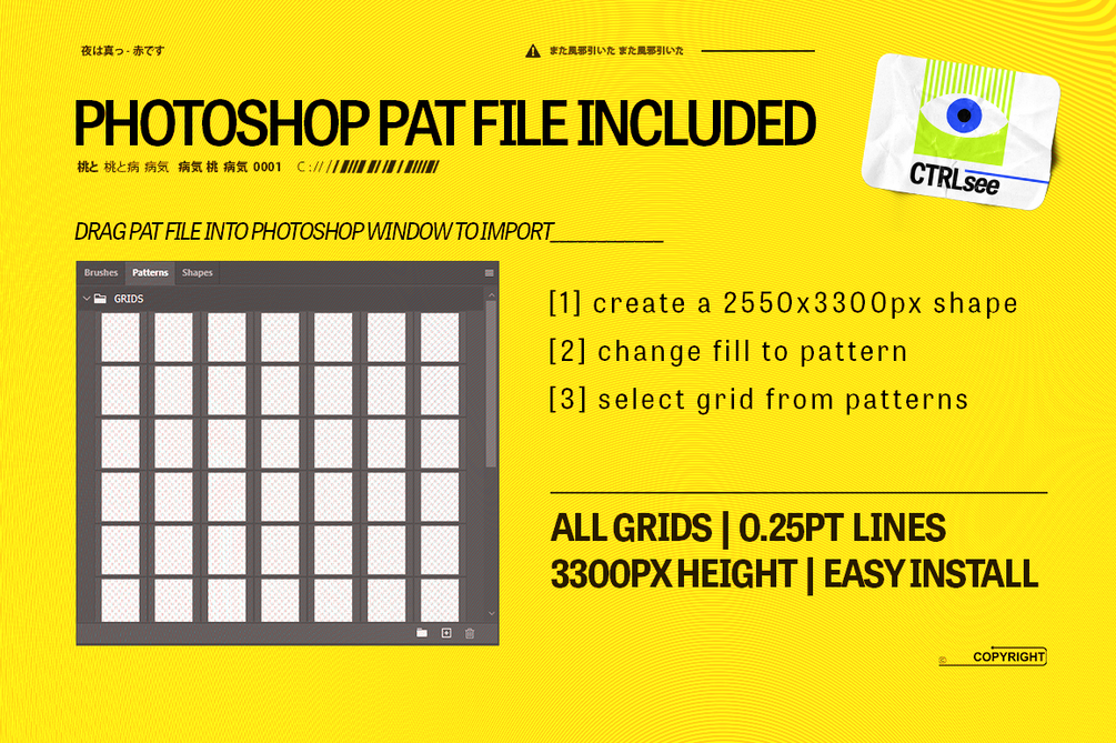 50 AI files, 50 EPS files, 50 transparent PNG files, 50 JPG files, 1 PAT file for Photoshop containing all grids